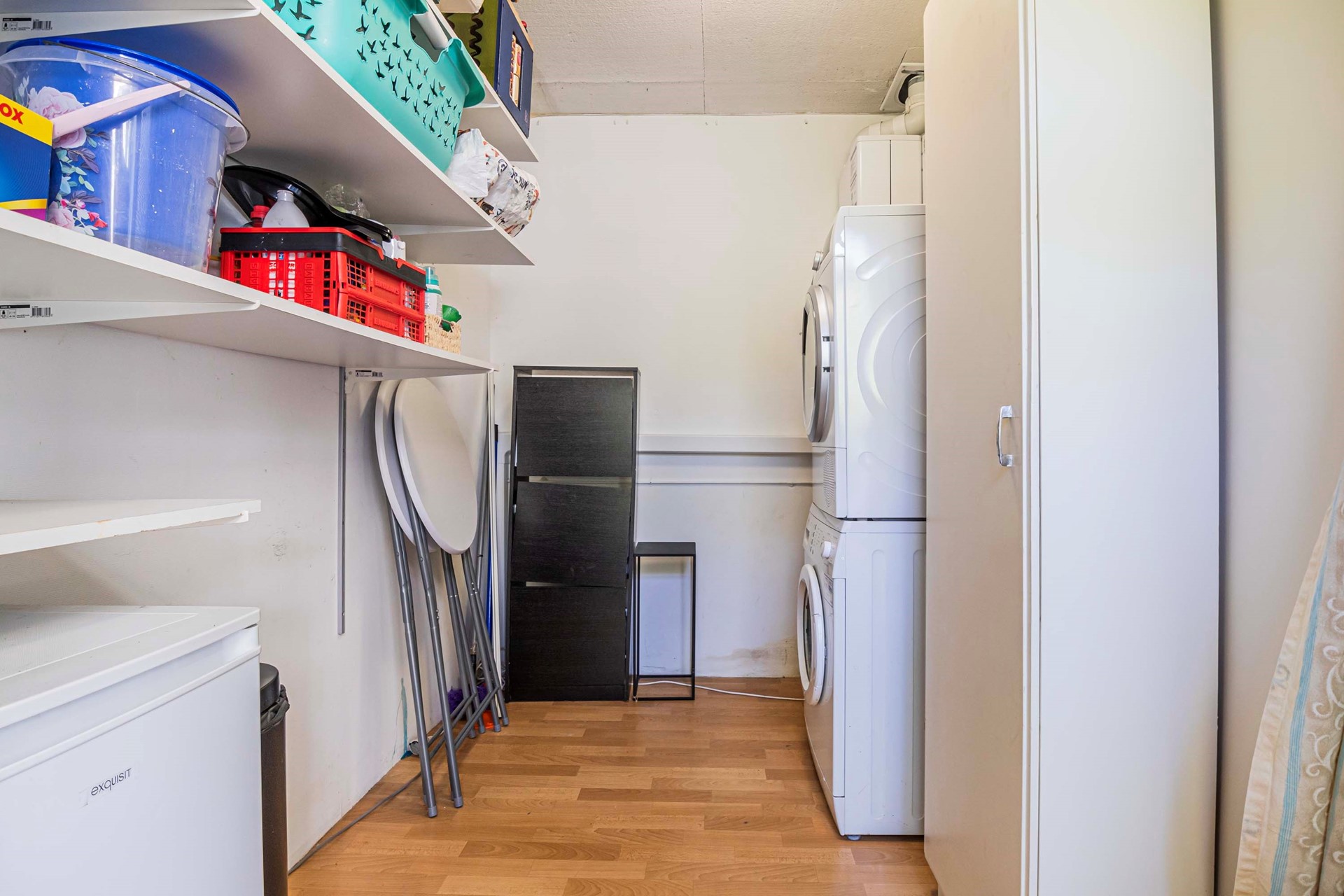 Aansluitend is de praktische bijkeuken bereikbaar, perfect voor het plaatsen van de wasmachine en extra bergruimte. Via de bijkeuken loop je zo de tuin in.