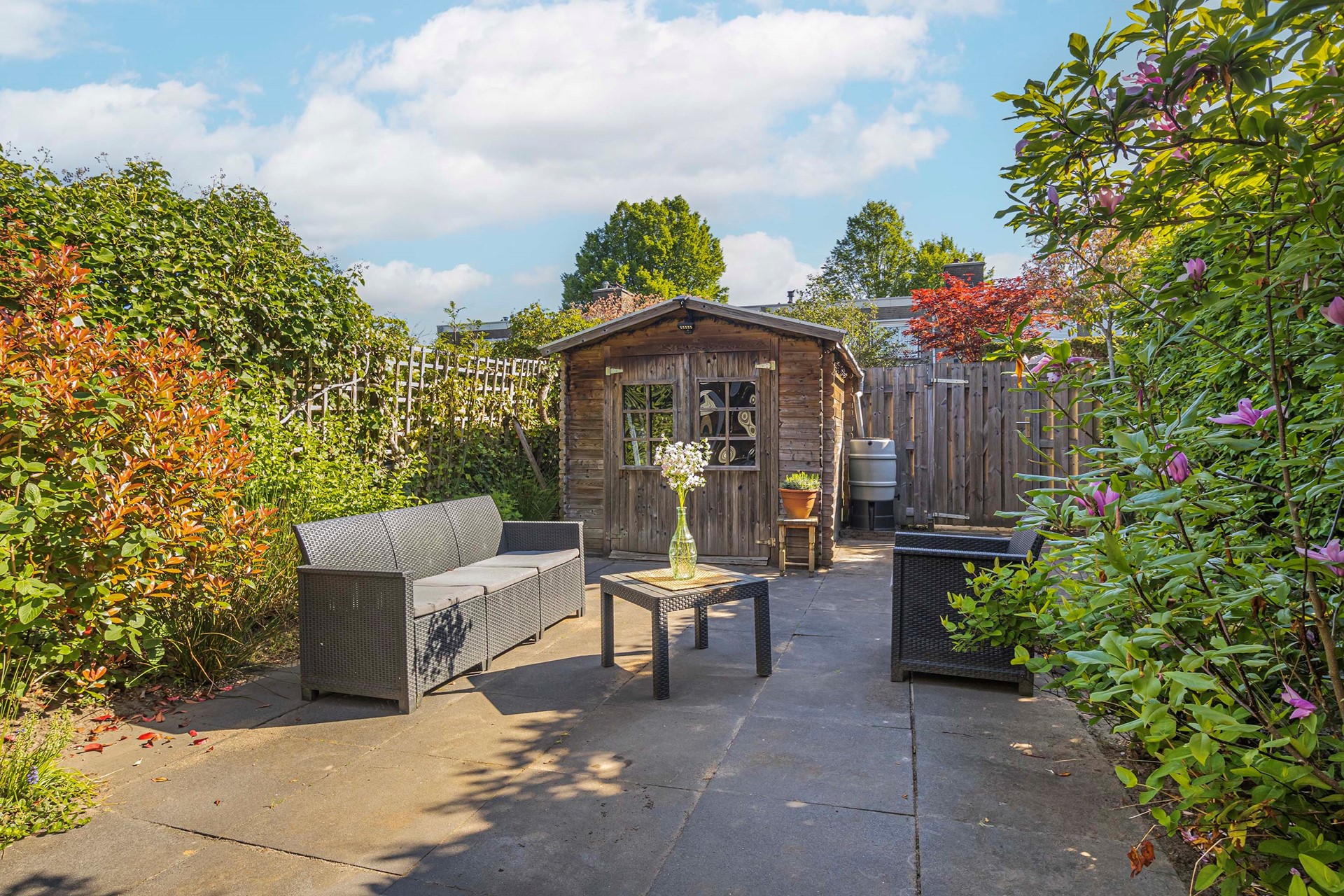 De diepe achtertuin ligt op het noordoosten, waardoor je al vroeg in de ochtend van het zonnetje kan genieten.